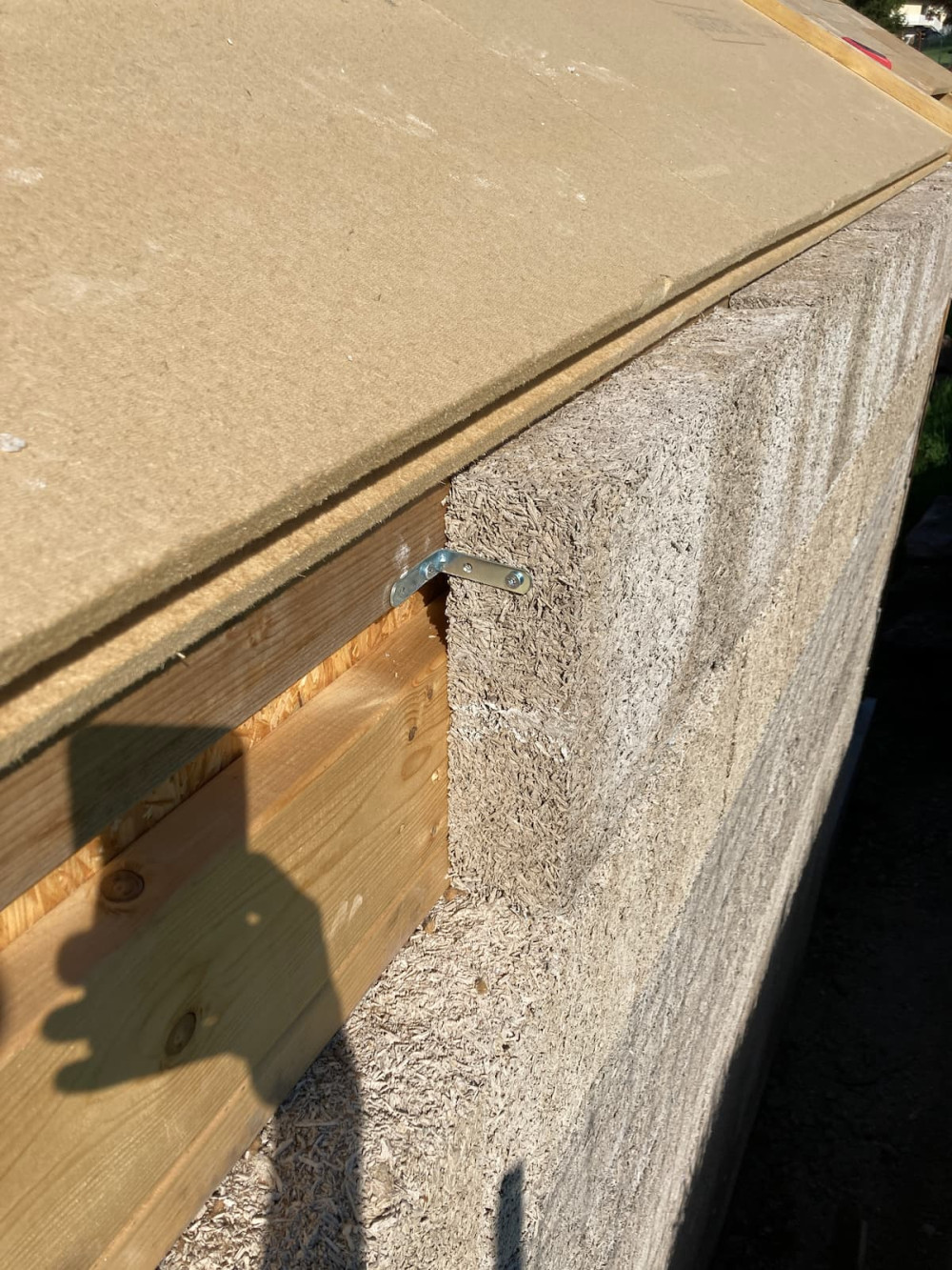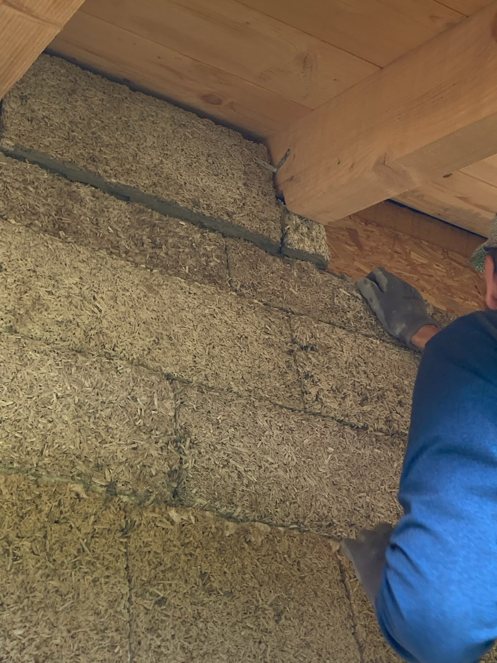 Enfin on procède à une étape essentielle, on emballe notre charpente avec des briques de chanvre de finition ce qui permettra d'appliquer correctement l'enduit jusqu'en haut et assurer une continuité de protection et d’étanchéité.
