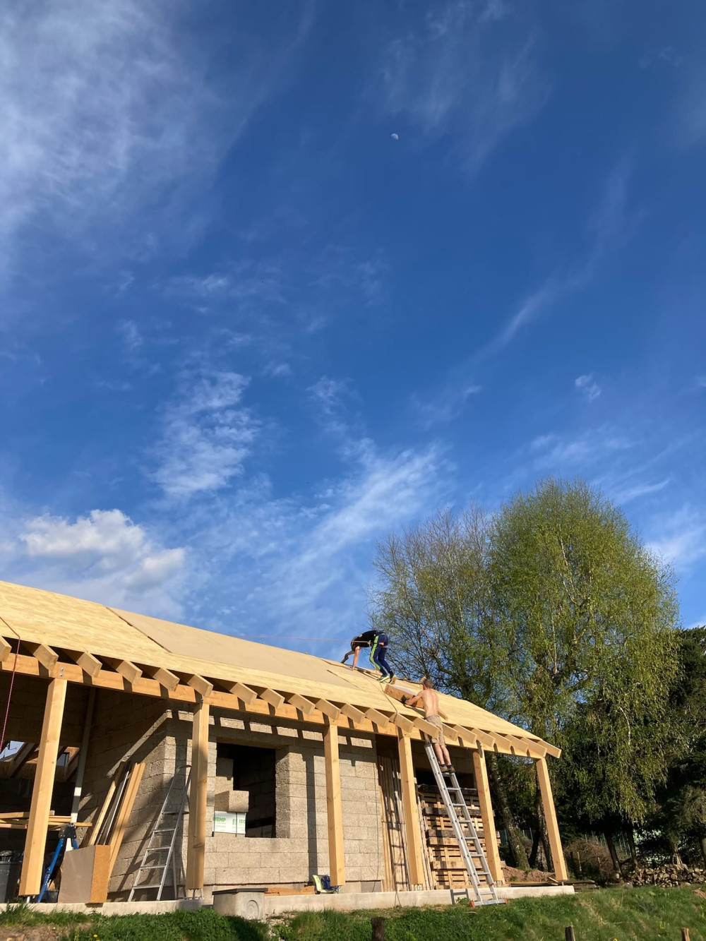 On fabrique des caissons en installant des panneaux OSB entre les poutre en I. Ce qui nous permet d'insérer des panneaux d'isolant en fibre de bois souple par le dessus. Ce qui est assez pratique quand il n'y a pas de pluie. On recouvre ensuite les poutres en I avec des panneaux en fibre de bois rigide de 60mm d'épaisseur qui une fois assemblés avec rainures et languettes forment une surface étanche à la pluie. Parfait pour protéger l'isolant en dessous même si la météo est clémente en ce mois d'avril. Cette étape était très physique car il y a eut beaucoup de matière à transporter et d'aller retour sur l'échelle pour monter et descendre du toit. Il faut être à l'aise en hauteur car même avec des outils de sécurité comme une corde et un baudrier cela reste acrobatique.
