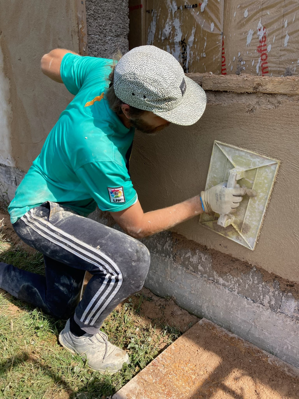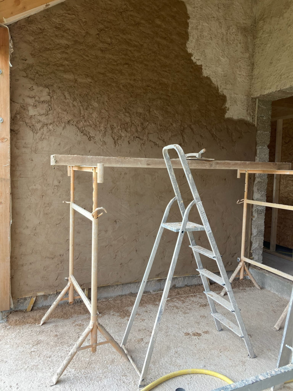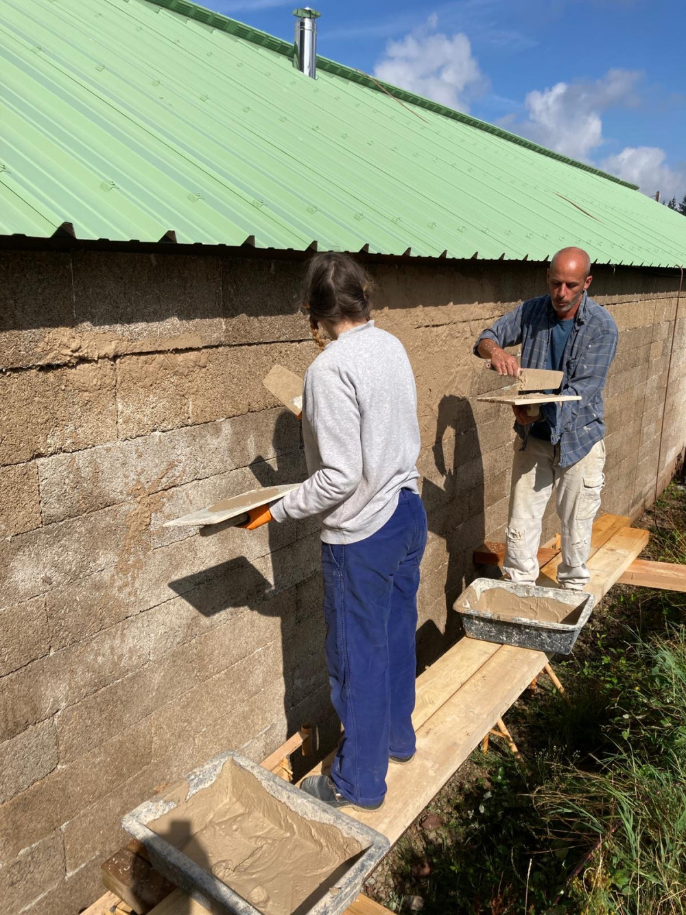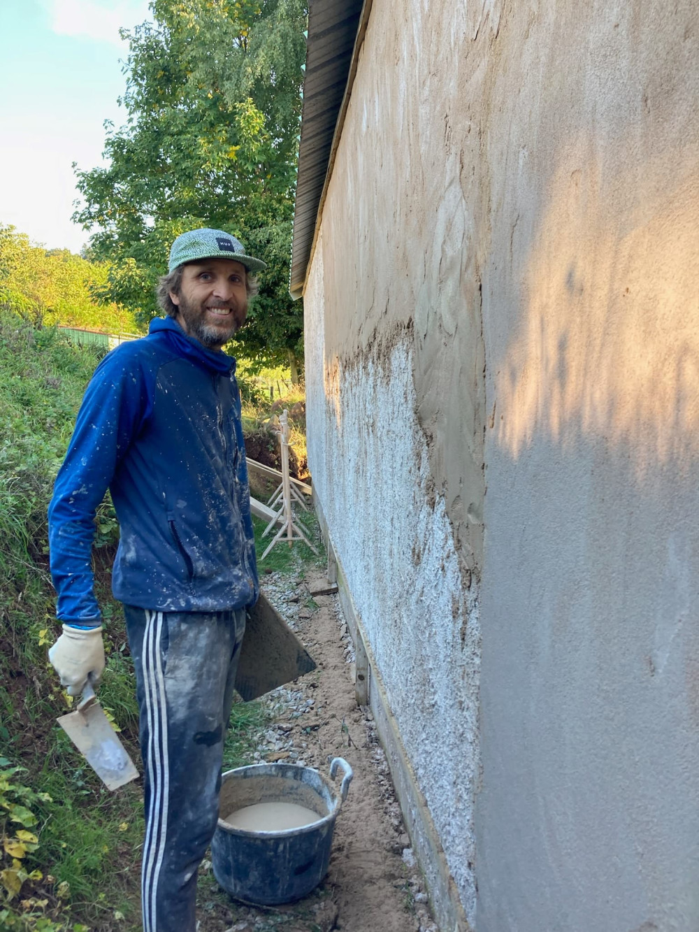 L'enduit se prépare avec une bétonnière en mélangeant du sable, de la chaux et de l'eau. En respectant bien sûr des quantités définies. On a choisi de faire notre enduit en 3 couches. D'abord une couche d'accroche assez fine, ensuite un corps d'enduit d'environ 1 cm, et enfin une couche de finition. Préparer le mélange, assembler des échafaudages de fortune, déplacer la matière, la projeter sur le mur avec une truelle et lisser l'ensemble avec une taloche représente une quantité énorme de travail. Une quantité qu'on avait clairement sous estimé.