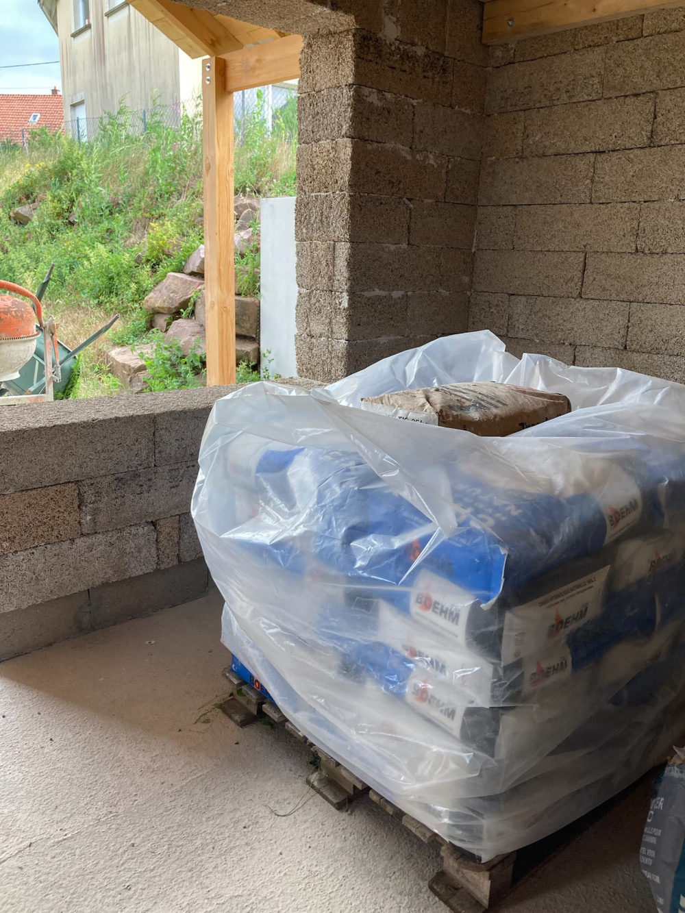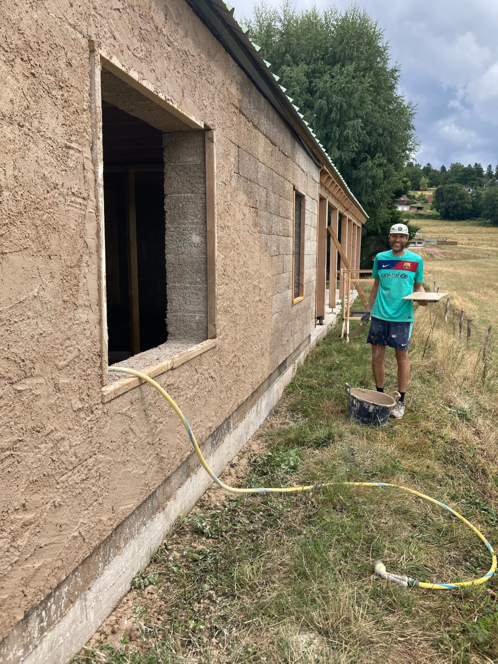 Les murs de la maison ont été assemblés avec des briques de chaux/chanvre. Un matériau avec de nombreuses qualités mais aussi avec quelques contraintes. A ce stade la maison n'est pas étanche à l'air et les briques peuvent s’abîmer avec le temps, il est nécessaire de les recouvrir d'un enduit. Celui ci doit être perméable à la vapeur d'eau pour laisser "respirer" la maison et profiter des qualités du chanvre. Même si c'est ce qui est le plus courant, ici pas question d'utiliser un crépis étanche à base de ciment. Le matériau recommandé est la chaux. C'est un matériaux très ancien qui de nos jours a presque disparu. C'est un produit très similaire au ciment. C'est une poudre fabriquée dans un four à base de calcaire. Boehm, un des rares fabricants français est justement basé en Alsace à seulement quelques kilomètres.
