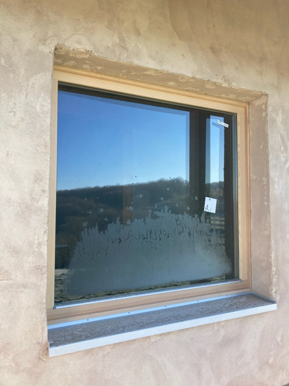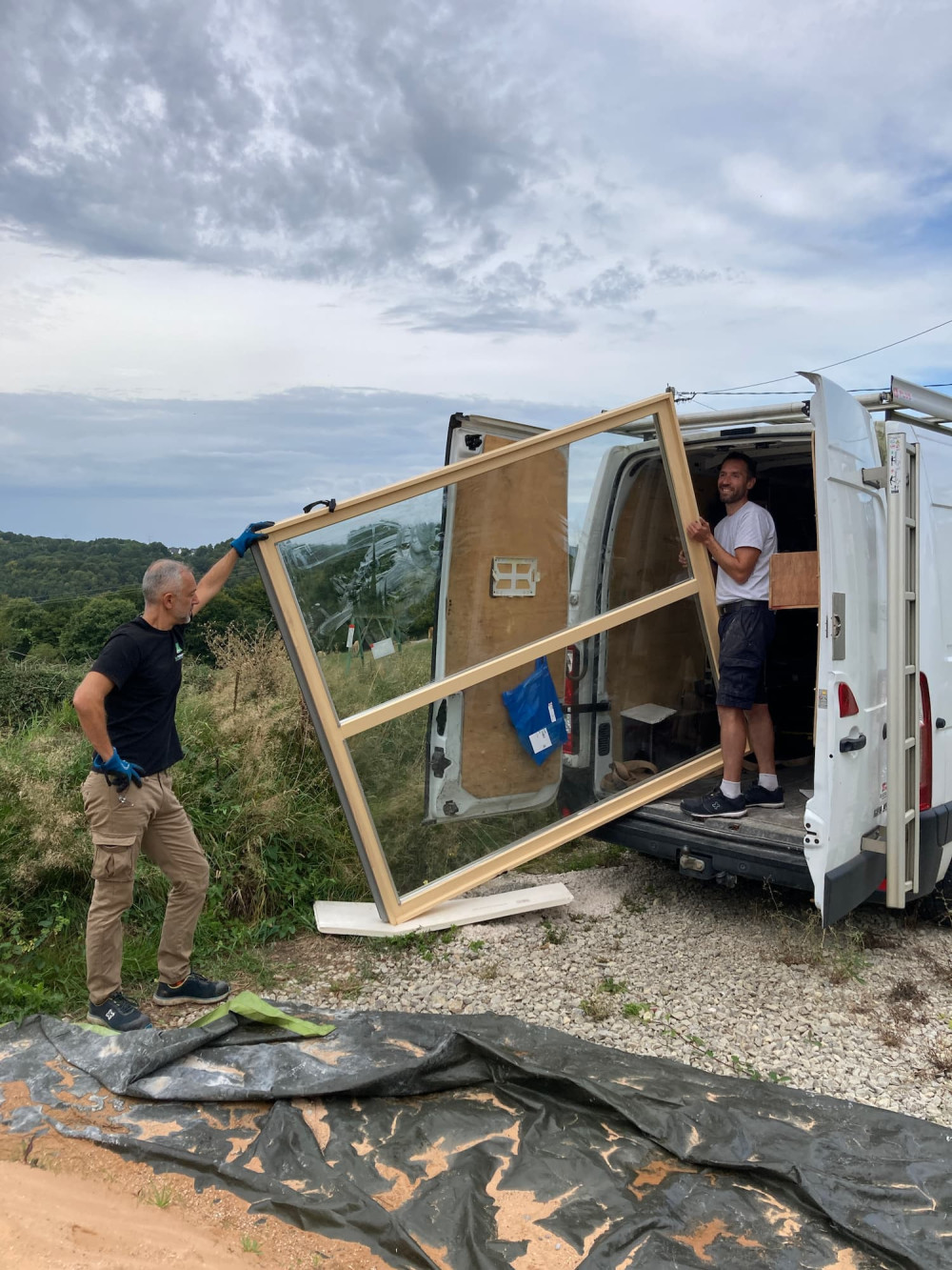 Aujourd'hui c'est Pipo et son équipe qui arrivent avec nos 10 menuiseries fabriquées en Pologne avec du pin du nord. La qualité des fenêtres à l'air excellente. On est bien content qu'ils s'occupent de l'installation car les menuiseries sont lourdes. Il faut utiliser des ventouses et faire très attention car un vitrage reste fragile. Il n'y a pas droit à beaucoup d'erreur.