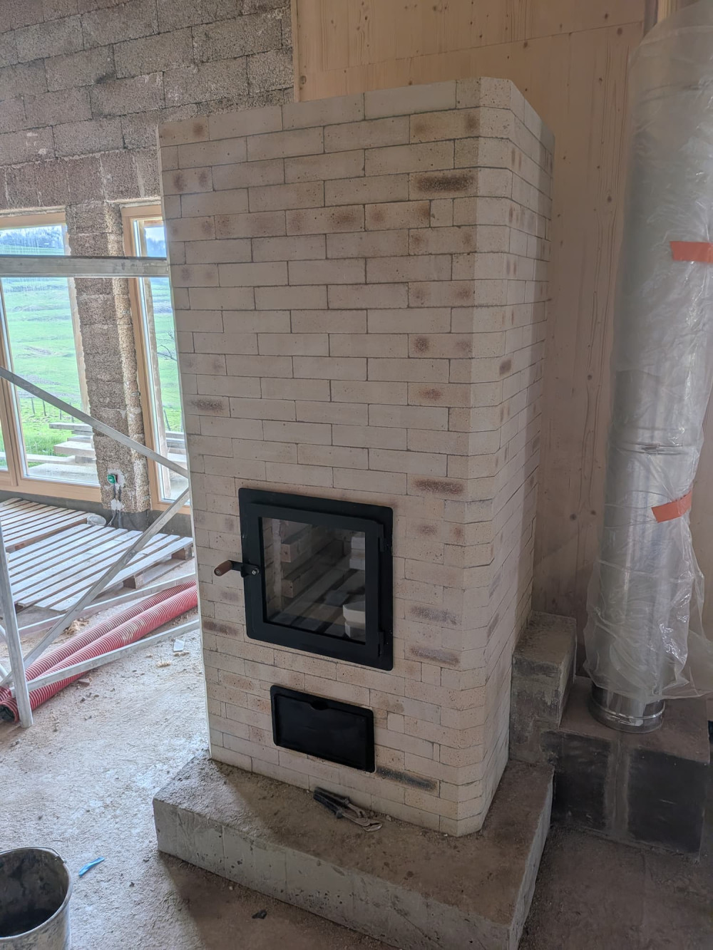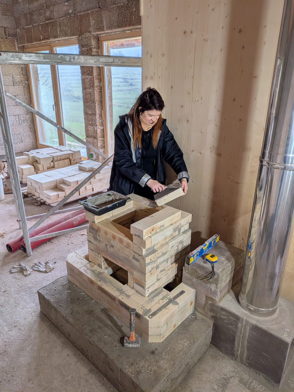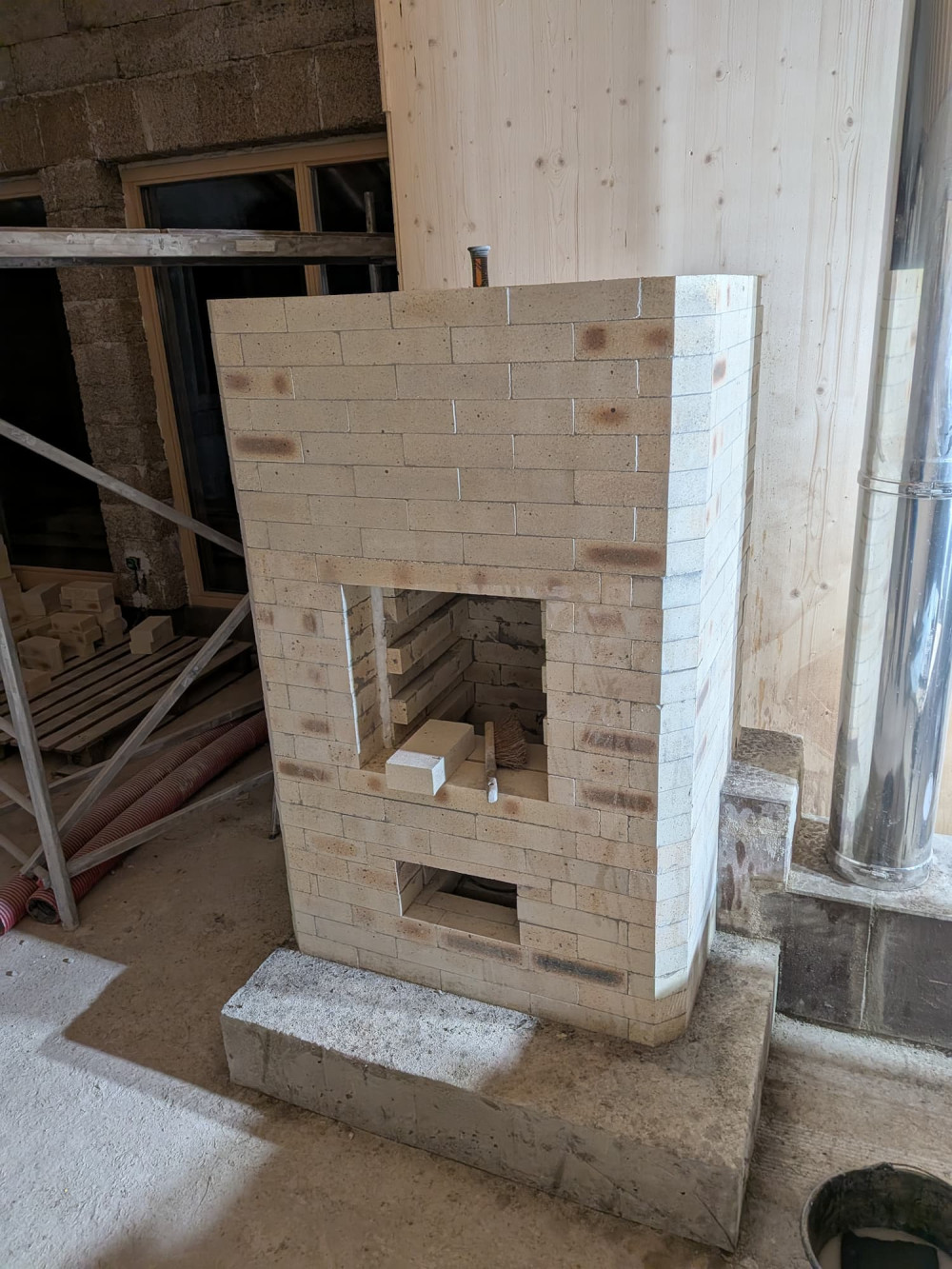 Le poêle est basé sur un plan open source et kit de briques prédécoupées. J'ai fait un stage de 3 jours auprès de l'association derrière le poêle pour découvrir les grandes lignes de son fonctionnement et aussi comment le monter en pratique. On réceptionne donc plus de 2 tonnes de briques réfractaires. Ce sont des briques spécialement conçues pour supporter des hautes températures. Pour le montage, on suit un plan en 3D qu'on visualise sur un ordinateur portable qu'on apporte sur chantier. Les briques sont assemblées avec un joint mince de seulement 1 ou 2 millimètres de ciment spécifique (un produit très facile à manipuler de la marque refracol). Comme il n'y a presque aucun ajustement possible au niveau des joints il faut être minutieux. On s’applique pour avoir un ouvrage bien droit et régulier. On nettoie les briques au fur et à mesure car on trouve les briques plutôt jolie et on compte laisser l'enveloppe du poêle apparente dans notre pièce de vie. Après environ une semaine de travail, on termine par le montage des portes et des différentes trappes de ramonage. Pour fonctionner le poêle a besoin d'une cheminée d'évacuation des fumées par le coté et d'une arrivée d'air extérieur par le dessous.